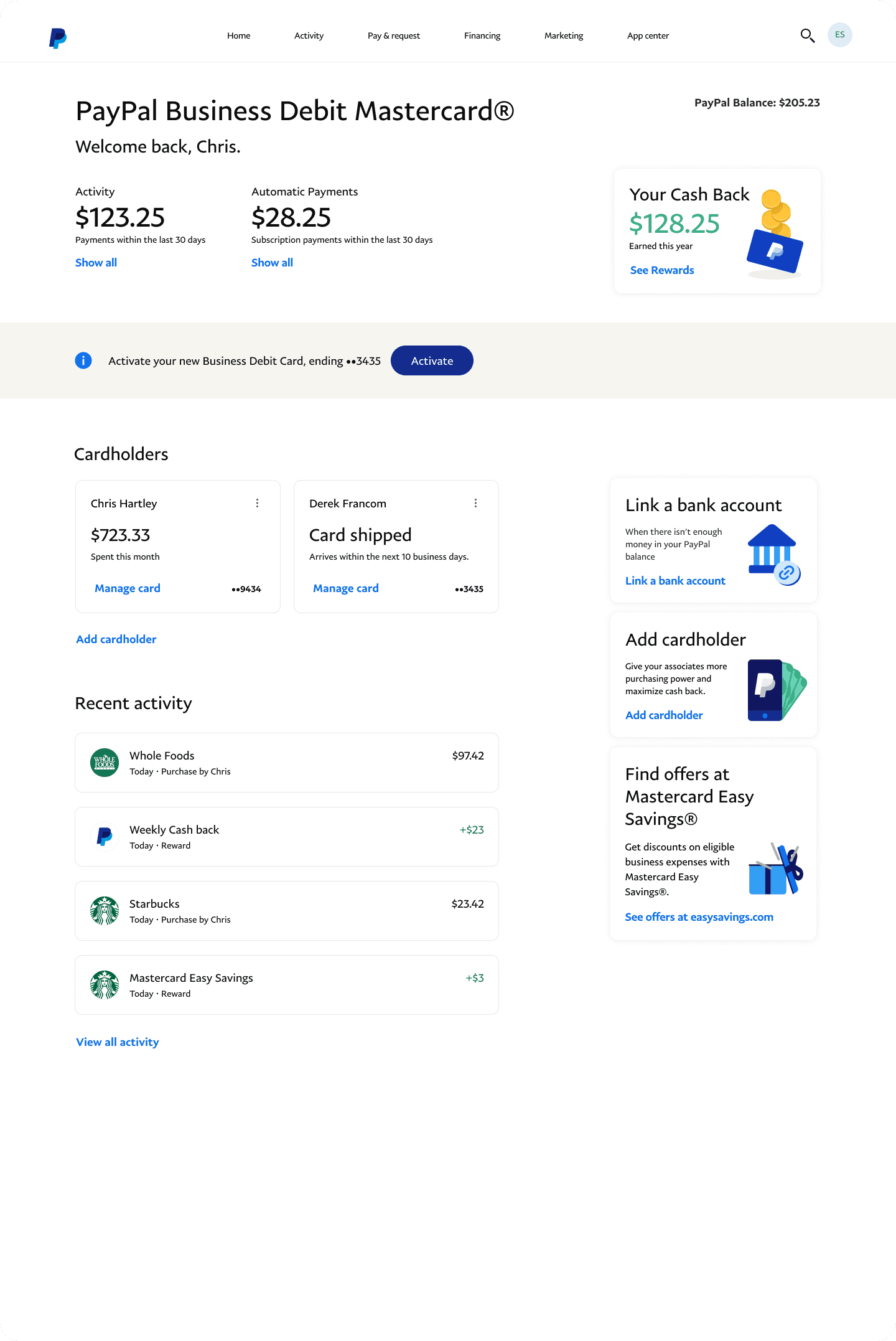 I led the design work for PayPal’s Business Debit Mastercard. A key objective was to develop new functionality that enabled multiple cardholders within the same business account, a feature designed to better support teams and streamline business spending.